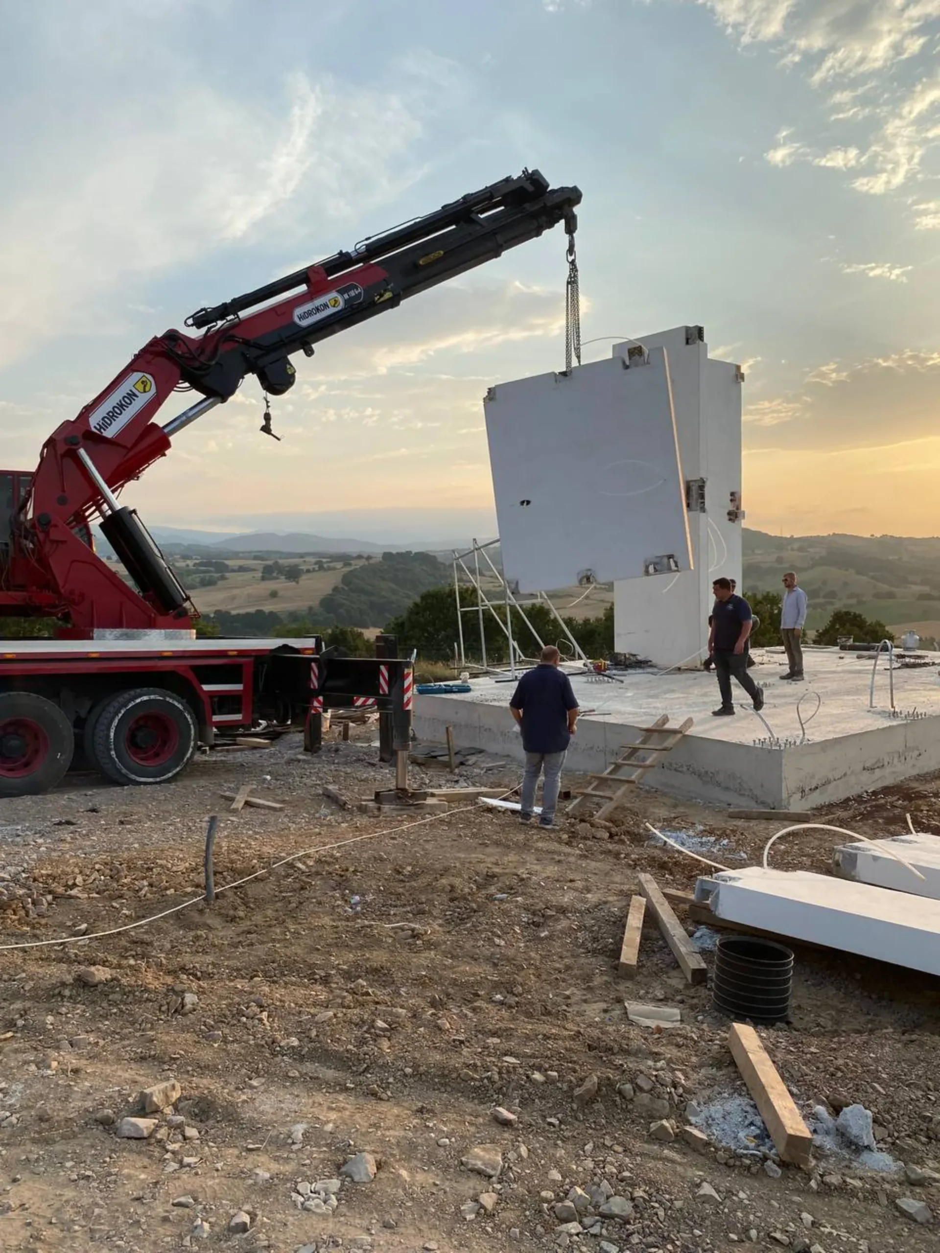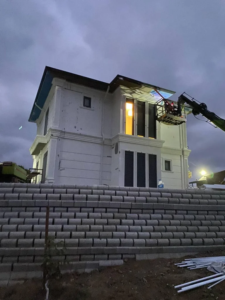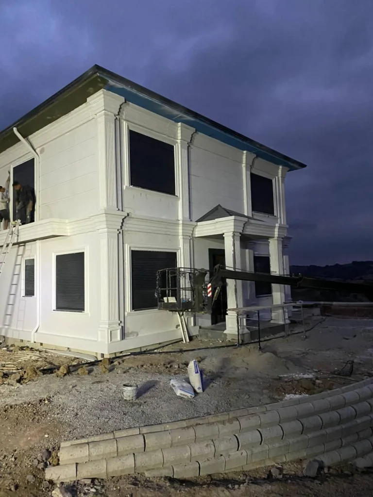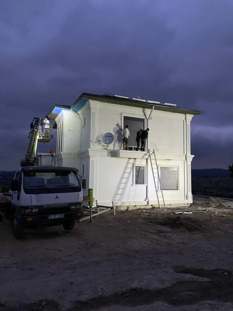 250 m2 prefabrik hibrit bina yapım işidir. İşin kapsamında ; 420 mt derin zemin sondajı yapılarak başlanan projede toprak altına 1700 mt PPrc boru döşenmiştir. Bu borular ile toprak ısısından yararlanarak binanın ısınma ve soğutma ihtiyacı karşılanması planlanmıştır. Betonarme temel üzerine çelik ankrajlar konularak fabrikada üretilmiş olan 25 cm kalınlığındaki katmaları arasında ısıtma ve soğutma boruları bulunan çelik konsrüksiyon beton duvarlar ile bina kısa sürede oluşturulmuştur. Çelik konsrüksiyon sayesinde yüksek sağlamlığa sahiptir. Son derece yalıtımlı olan prefabrik beton duvarlar binaya yüksek ısı yalıtımı sağlamaktadır.  Ayrıca çatıya konulan güneş panelleri yardımıyla sıcak su ihtiyacı karşılanmıştır. Yapılan makine dairesine konulan ısı pompası yardımıyla binanın duvarları arasına yerleştirlmiş su boruları içerine pompalanan ısıtılmış/ soğutulmuş su ile konforlu bir ortam sıcaklığı sağlanmıştır. Binanın ısıtma ve soğutma sistemi bu hibrit sistem sayesinde toprak ısısı, güneş enerjisi  ve elektrik enerjisi desteği ile yapılmaktadır.