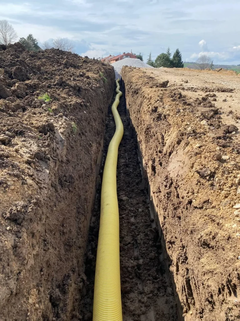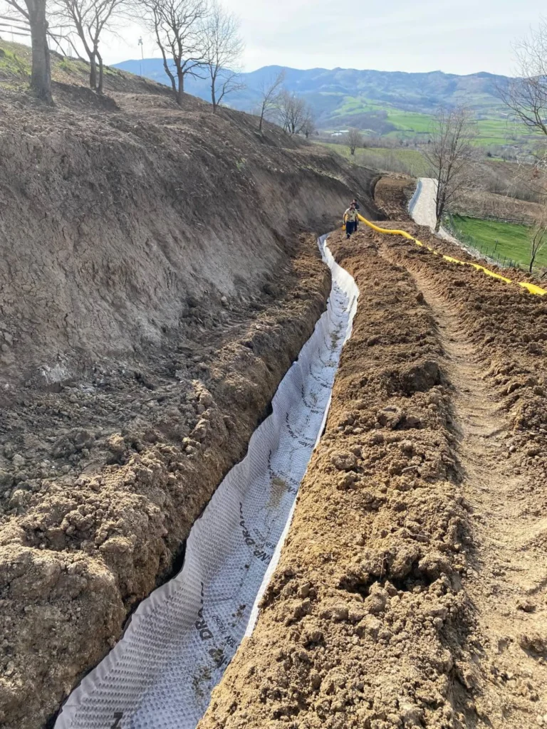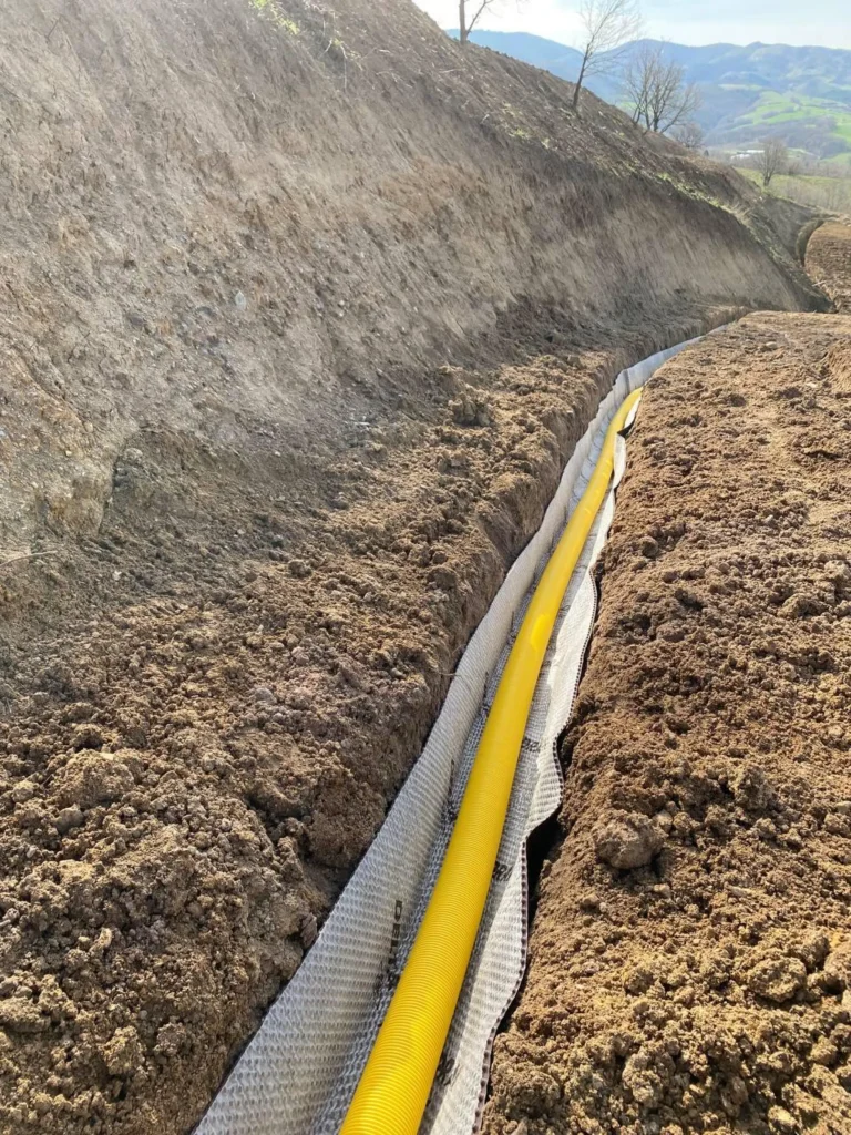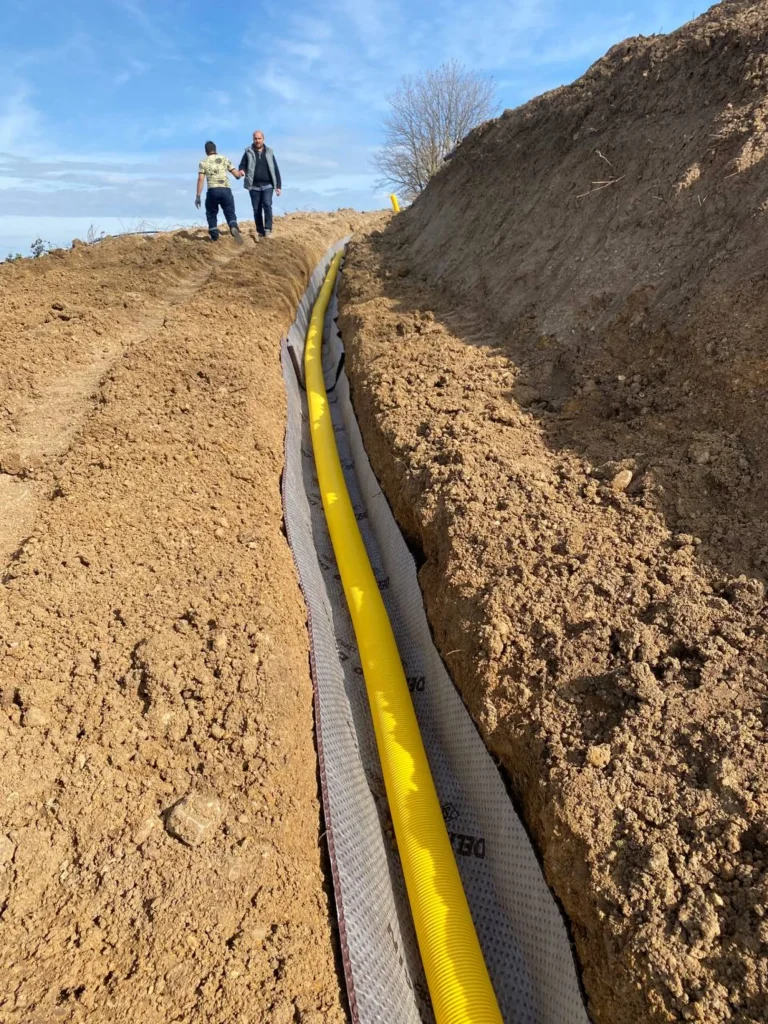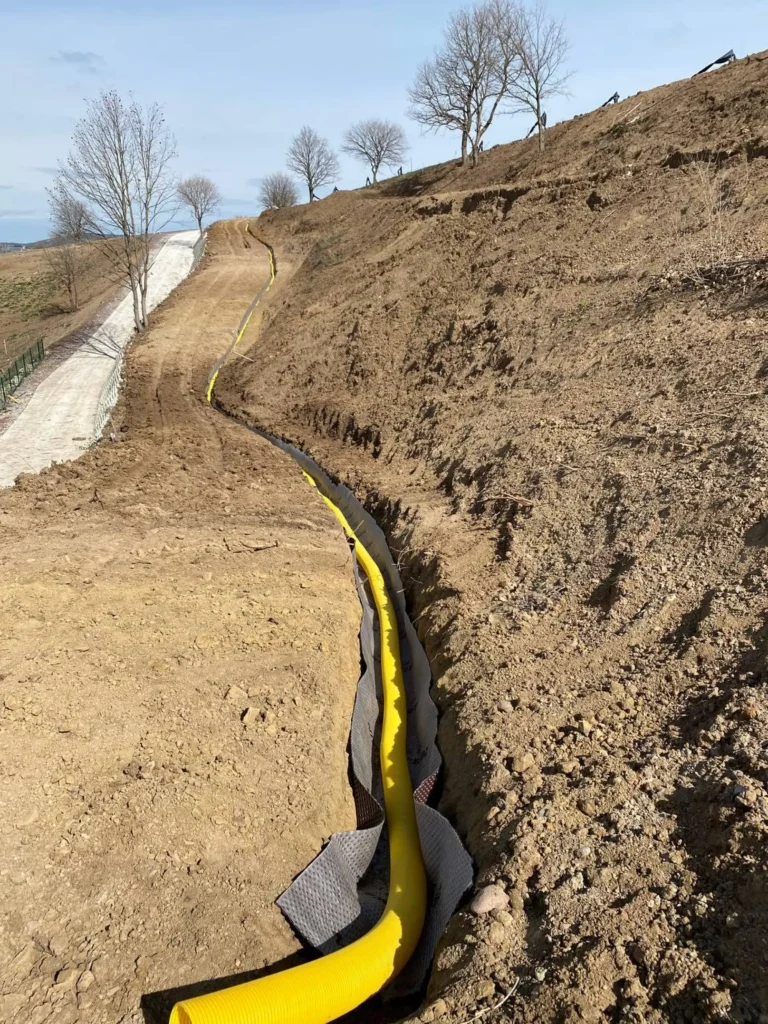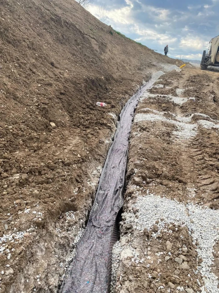 Yaklaşık 500 dönüm arazi içerinde farklı noktalarda yaklaşık 1,5 km uzunluğunda farklı kesit ve genişliklerde yağmursularının ve toprak altı dip sularının tahliyesi amacıyla drenaj hatları yapım işidir. İşin kapsamında ; kazı , drenaj levhası, geotekstil keçe, mcır dolgu yapılmıştır.