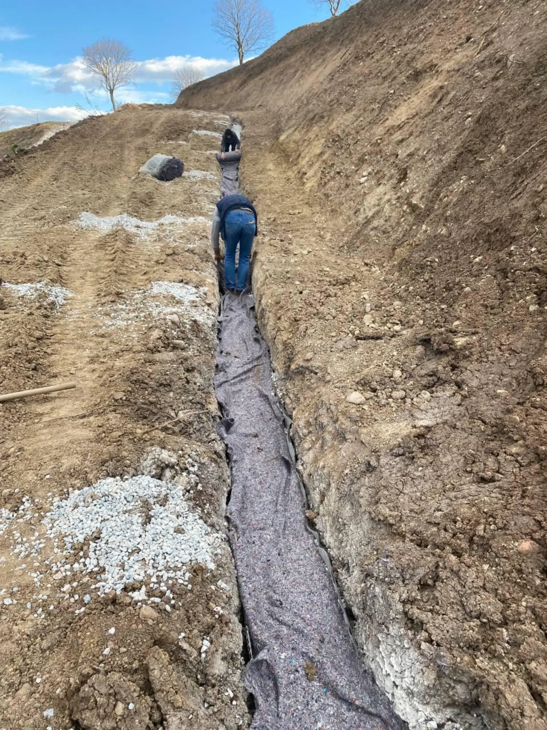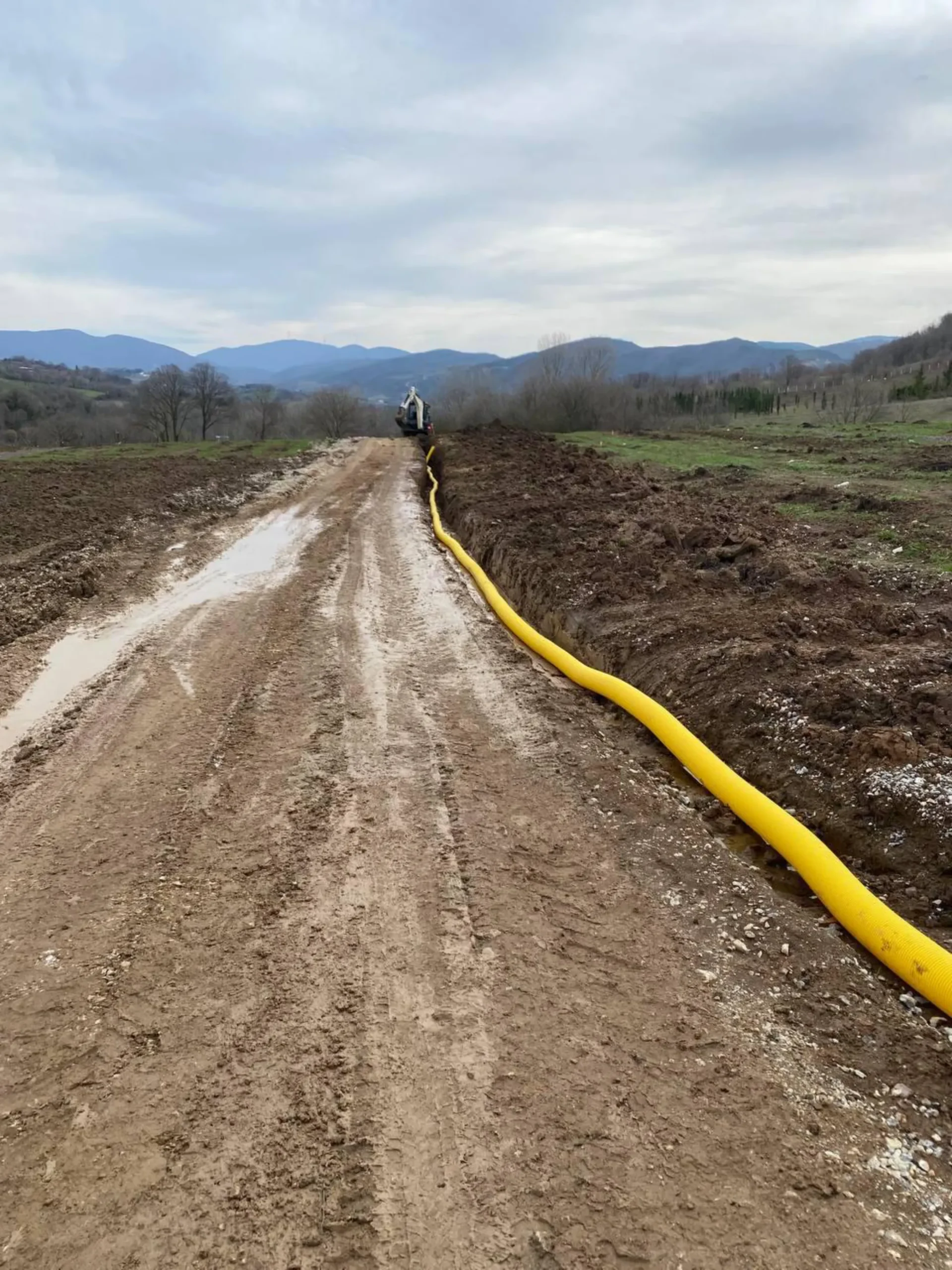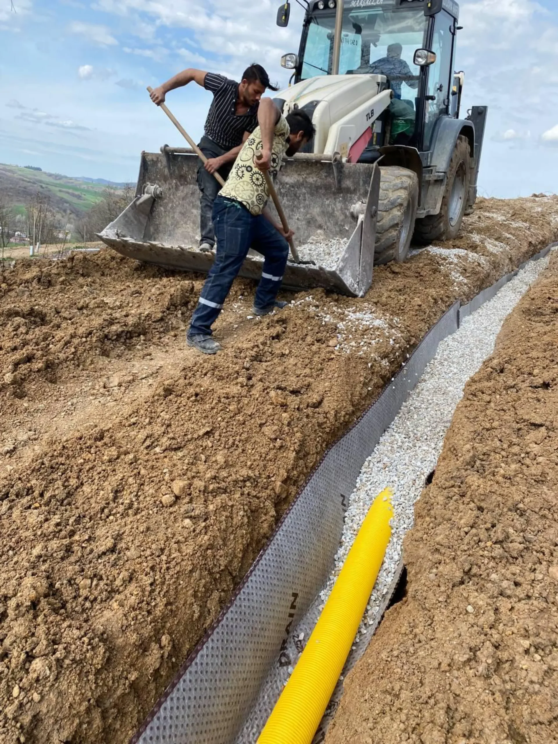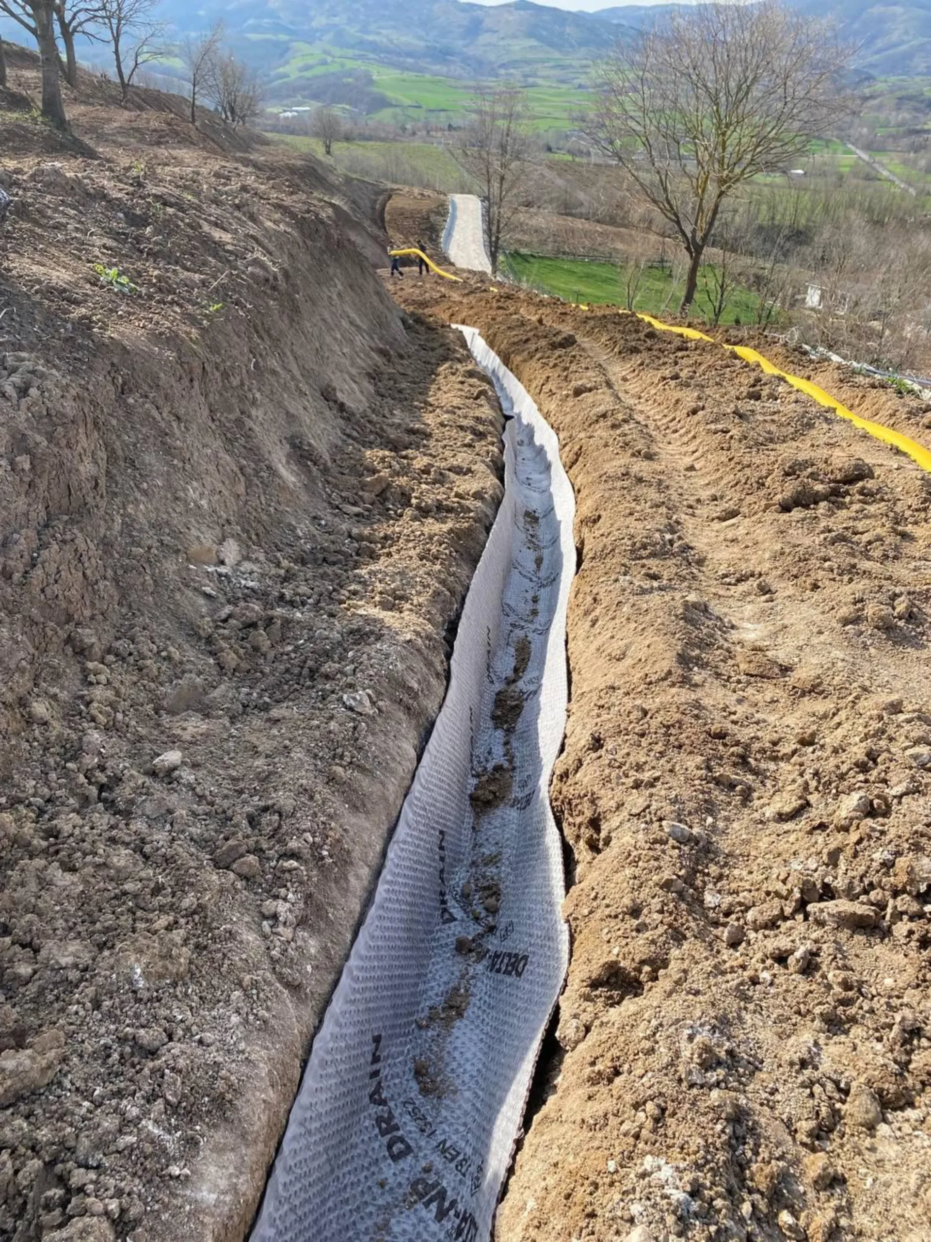Yaklaşık 500 dönüm arazi içerinde farklı noktalarda yaklaşık 1,5 km uzunluğunda farklı kesit ve genişliklerde yağmursularının ve toprak altı dip sularının tahliyesi amacıyla drenaj hatları yapım işidir. İşin kapsamında ; kazı , drenaj levhası, geotekstil keçe, mcır dolgu yapılmıştır.